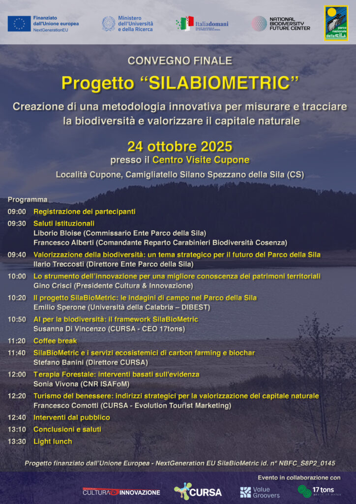 Avviato alla fine del 2024 e promosso dall’Ente Parco Nazionale della Sila in collaborazione con CURSA, il Consorzio “Cultura e Innovazione” (UNICAL) e il DIBEST – Dipartimento di Biologia, Ecologia e Scienze della Terra dell’Università della Calabria, il progetto “SilaBioMetric” è finanziato dal National Biodiversity Future Center (NBFC), nell’ambito del fondo NextGeneration EU, e punta a costruire un modello replicabile di gestione sostenibile del patrimonio naturale. Un approccio integrato che combina rilievi sul campo, immagini satellitari e tecnologie di analisi ambientale. A valle del primo incontro dell’11 ottobre dedicato a “Crediti di carbonio e filiere agro-forestali nel Parco della Sila”, il convegno del 24 ottobre non si limiterà a presentare gli output progettuali, ma aprirà una riflessione sulle prospettive di valorizzazione delle risorse ambientali del Parco, con l’ambizione di fare dell’Ente Parco Nazionale della Sila un promotore attivo di innovazione ecologica, sociale ed economica.